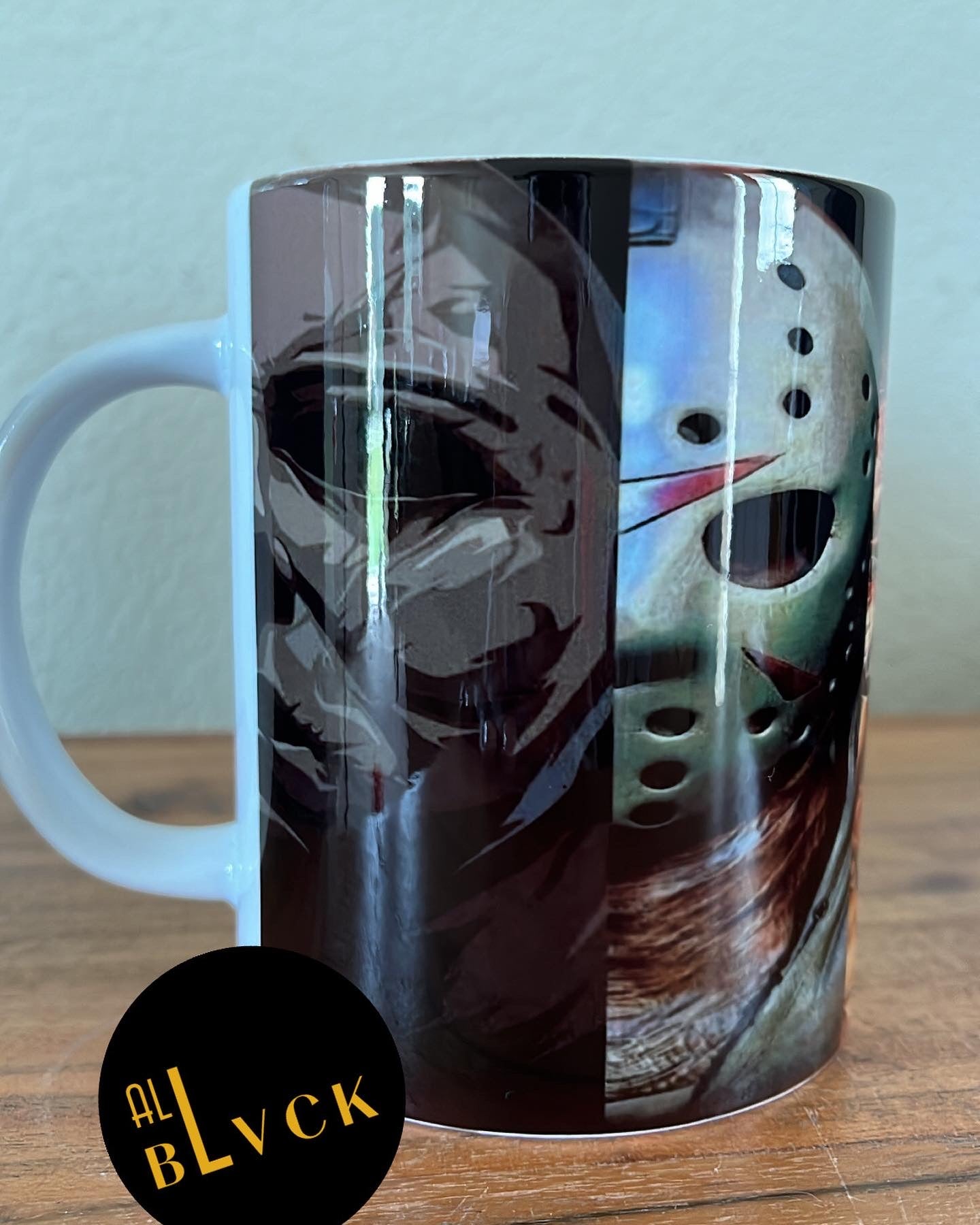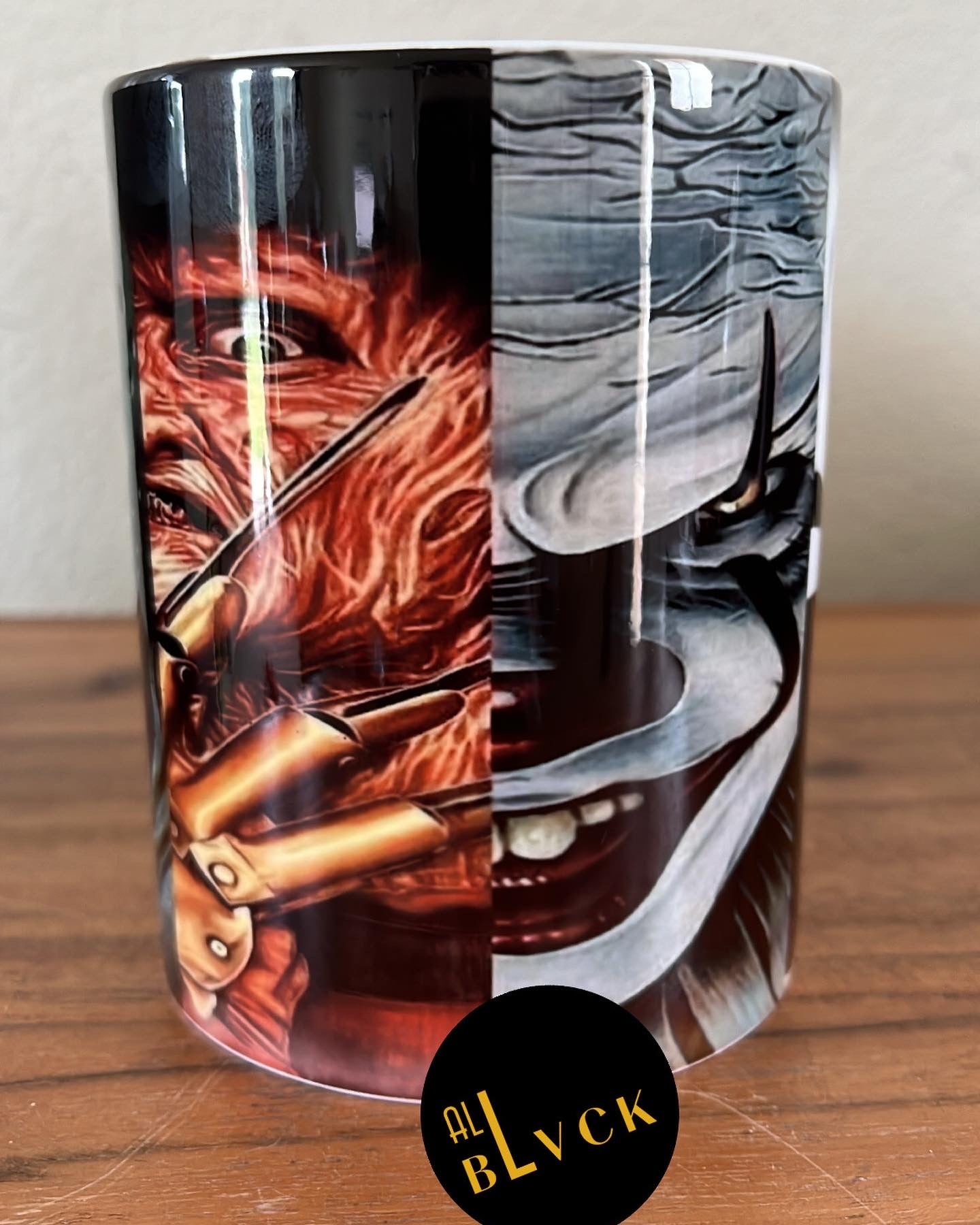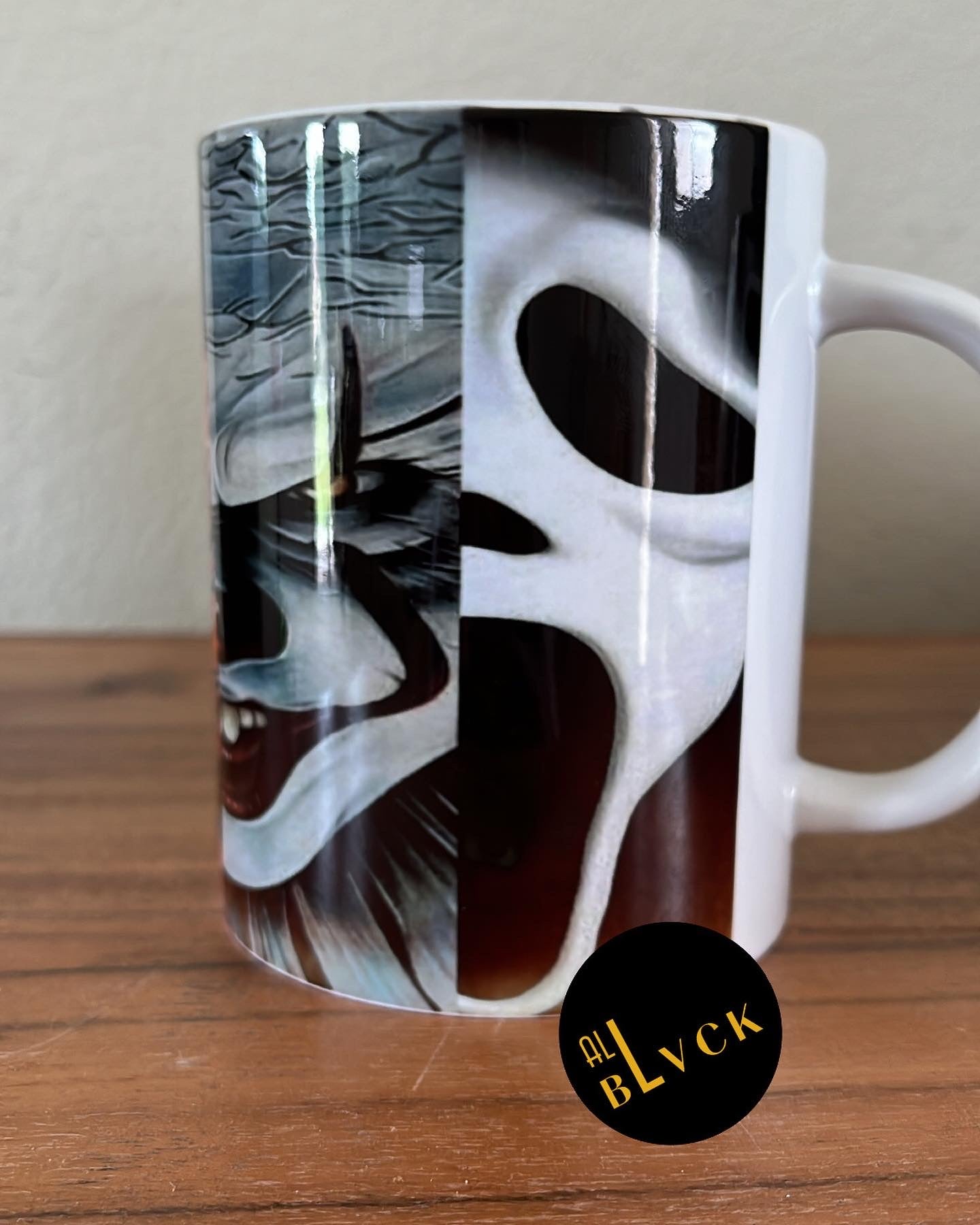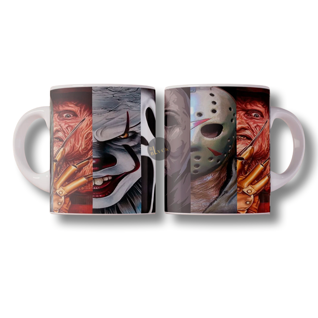 Halloween favorite "Faces of Horror" has a total of fives faces, Michael Myers, Jason, Freddy, Pennywise and Ghostface, around the mug.
